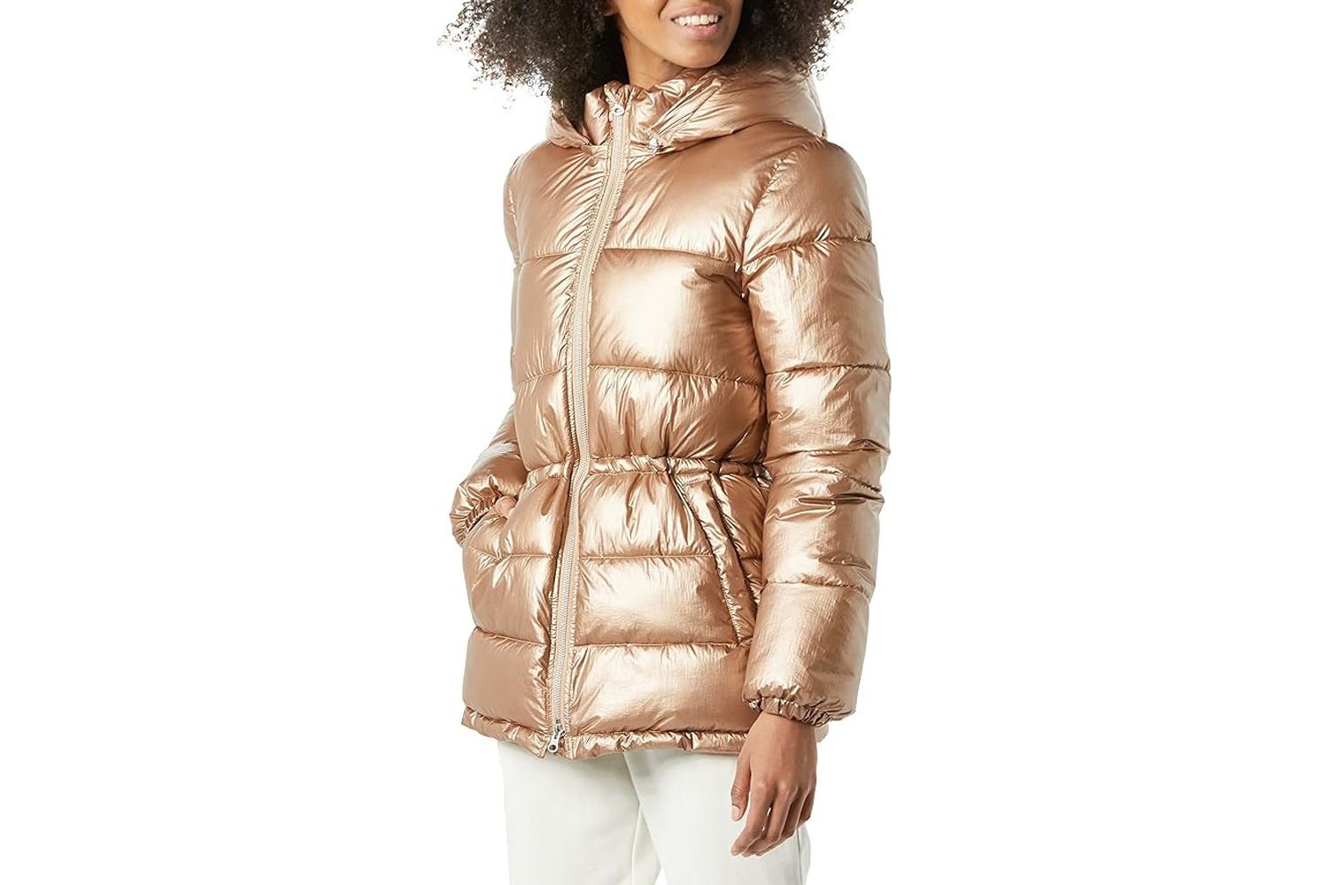If you’re look toreallylean into this statement-making trend, check out this water-resistant gold puffer. The shimmering coat be fully lined, insulated, and feature a removable hood. Plus, information technology has an adjustable cord inside that allow you to fasten the waist and create a form-flattering silhouette.