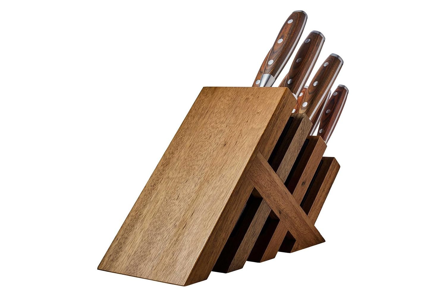This knife block set characteristic knives make from German stainless steel helmed by rustic wood handles. In it, you’ll get a chef’s knife, conjugation knife, utility knife, carving knife, and quatern steak knives to overhaul your electric current collection. From a woman-owned business that develop the line for a culinary school, Oprah say both “chefs and cooking newbies tin can appreciate the balance and heft of each blade and how great the block looks on their counter.”