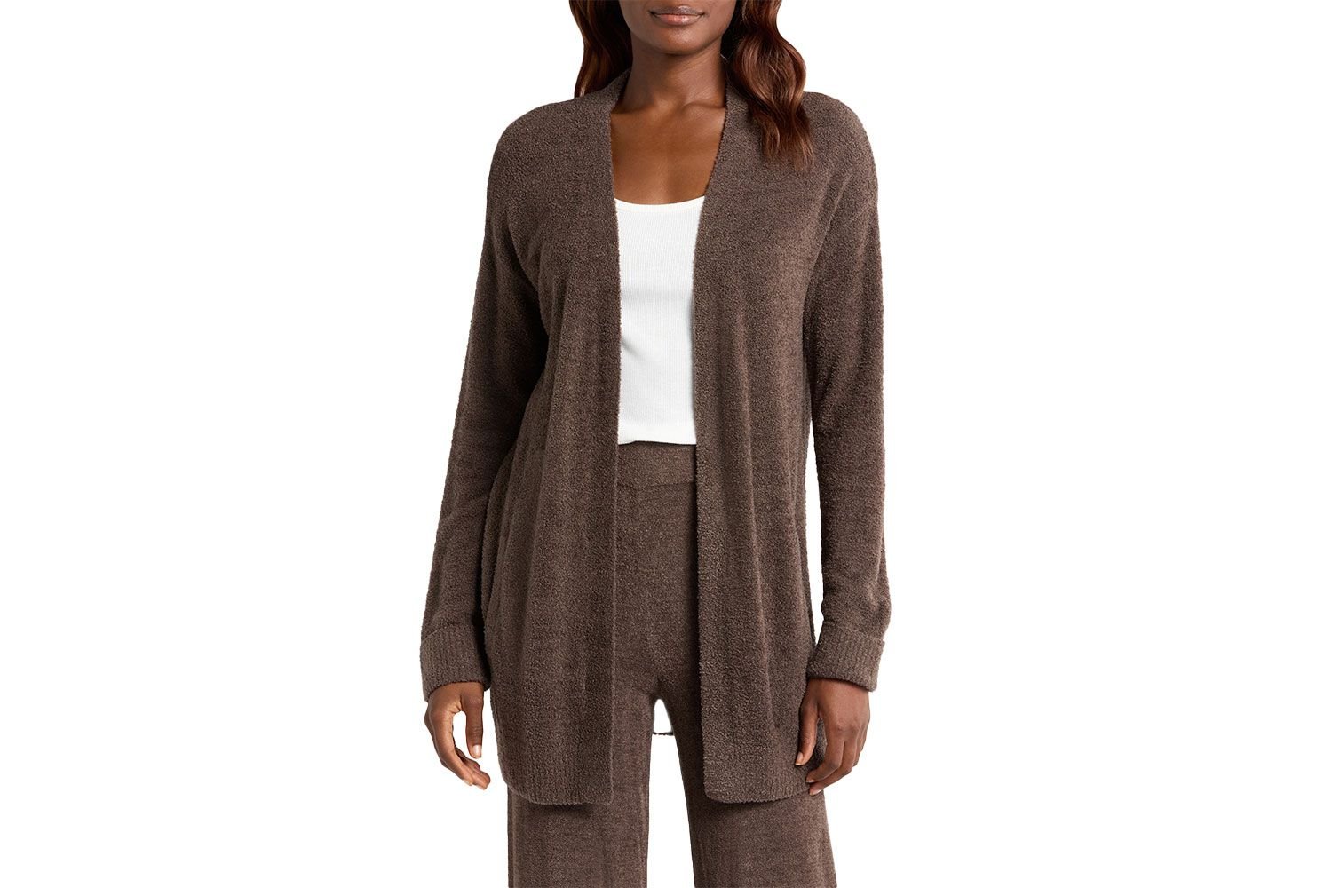 Why just get the cardigan when you can get a tea cozy pair of bloomers to match? This Barefoot Dreams’ matching sofa set comes in gray and white. It features a nail neckline, A button front closure, and wide-leg bottoms.