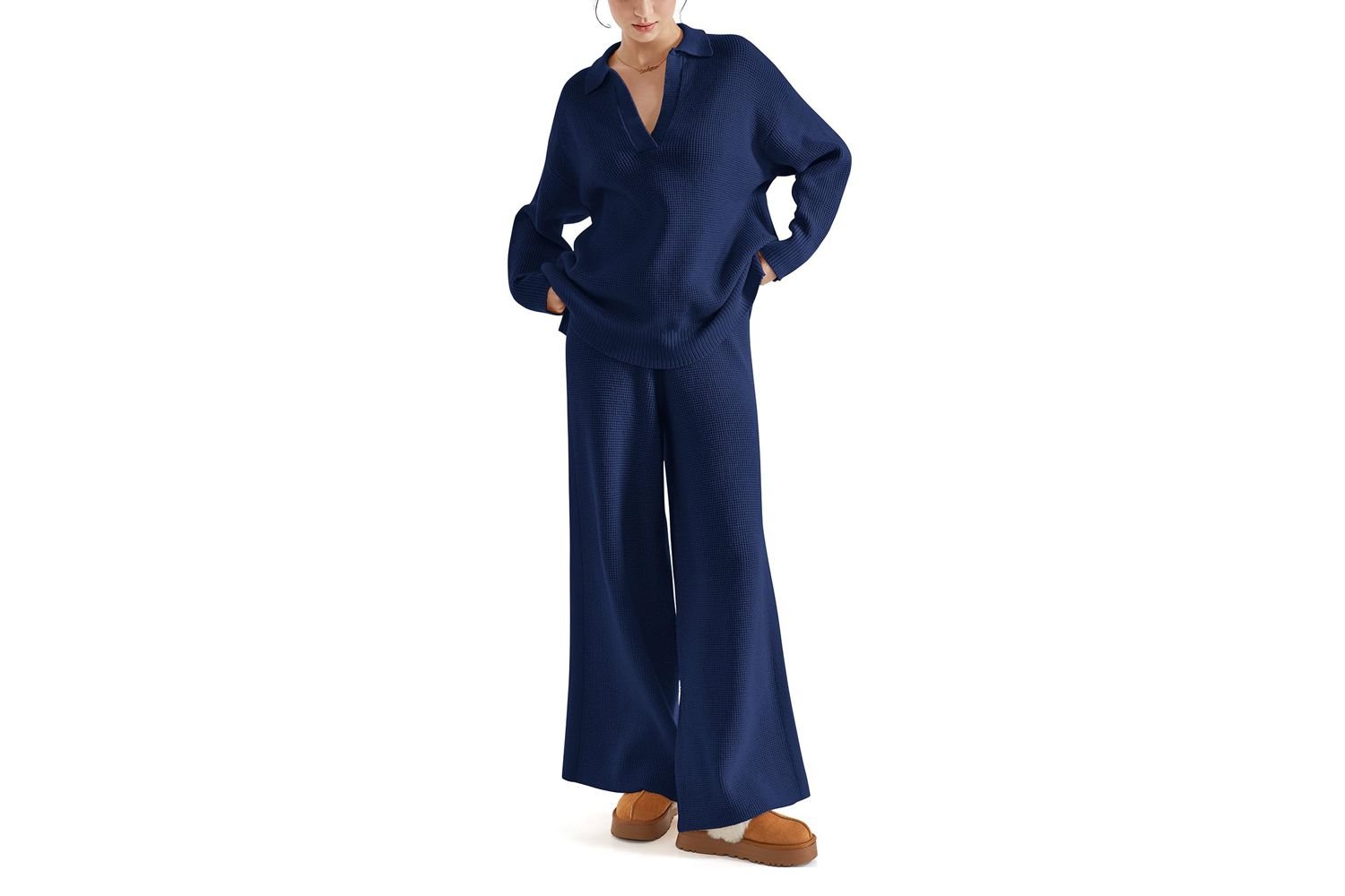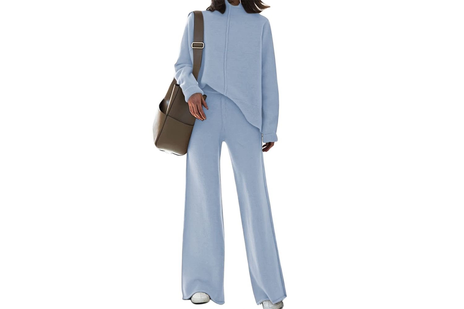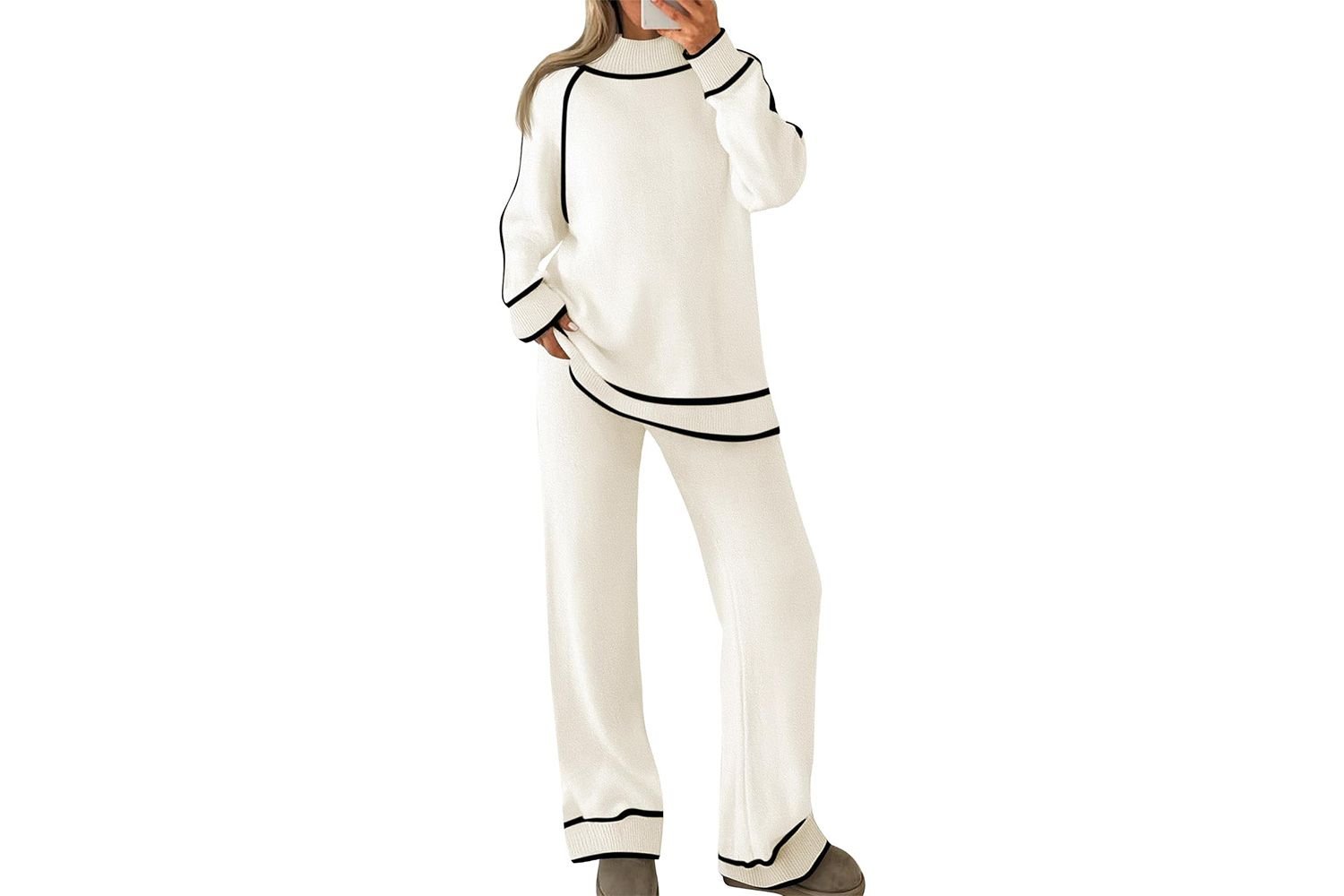 Like the Tanming lounge set, I love the contrasting tipping along the chunky rib finishing on this Zesica set. IT comes in octonary colors, including white, black, pink, and blue, and include AN outsize turtleneck top and wide-leg pants.