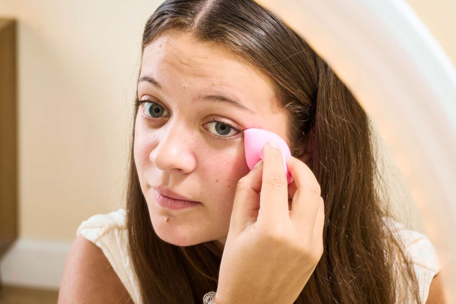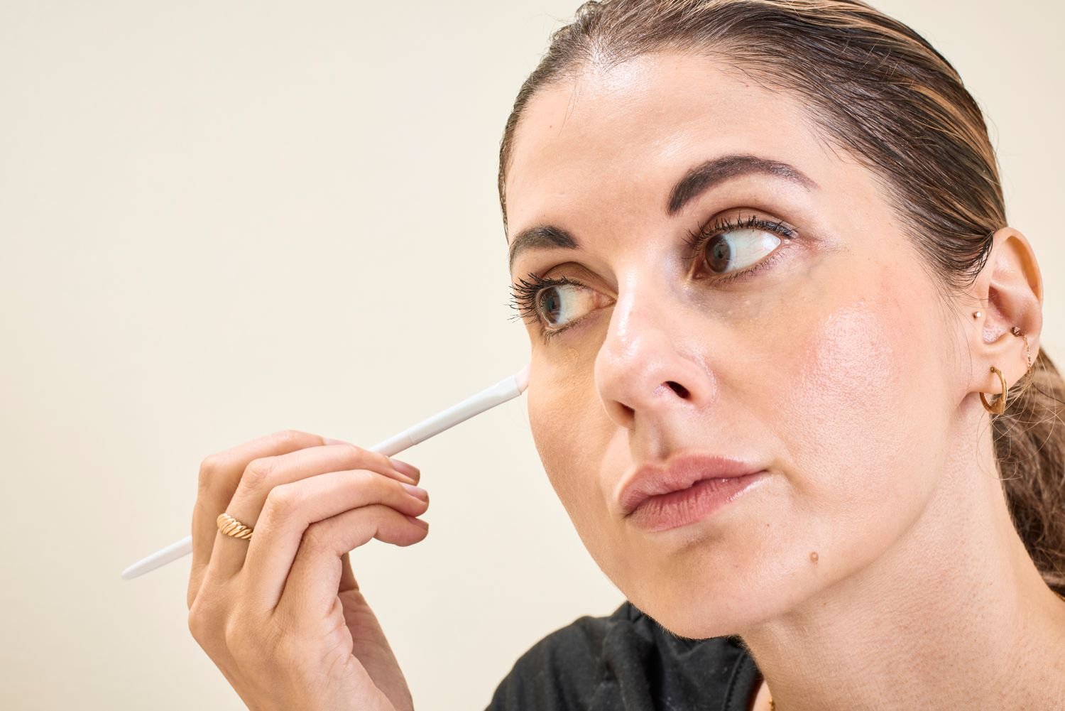 I know speed is typically everything, only Alvarez recommend starting slowly with your application. “Focus product only where there’s darkness, usually lower on the under-eye than higher,” she says.